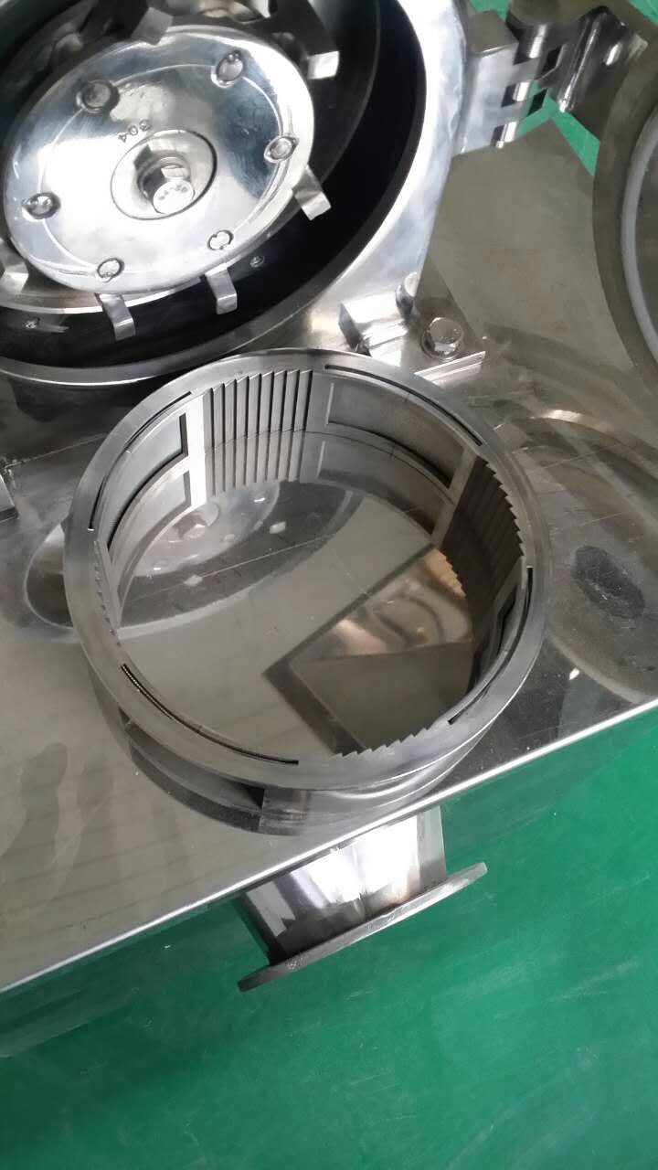 本機利用活動齒盤和固定齒盤的高速相對運動,使被粉碎物經(jīng)齒沖擊、磨擦及物料彼此間沖擊等綜合作用獲得粉碎。本機結(jié)構簡單、堅固、運轉(zhuǎn)平穩(wěn)、粉碎效果良好,被粉碎物可直接由主機磨腔中排出,粒度大小通過更換不同孔徑的網(wǎng)篩獲得,另外該機為全不銹鋼。機殼內(nèi)壁全部經(jīng)機加工達到表面平滑,改變了以前機型內(nèi)壁粗糙、積粉的現(xiàn)象、使藥品、食品、化工等生產(chǎn)能符各個生產(chǎn)商的需求,達到了GMP的要求。